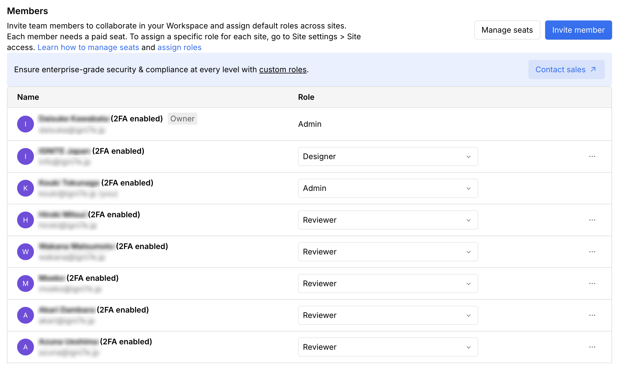 カスタムロールによるきめ細かなアクセス権限設定(RBAC)が可能で、編集者ごとにアクセスできるページやCMSコレクションを制限できます。2段階認証(2FA)は全アカウントで利用可能で、EnterpriseプランではSSO/SCIMにも対応しています。
