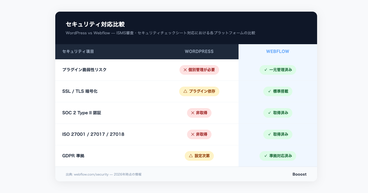 WebflowはSOC 2 Type II・ISO 27001/27017/27018などのセキュリティ認証を取得しており、GDPRにも準拠しています。これらの認証をエビデンスとして提出するだけで、プラットフォームレベルのセキュリティ説明が完結します。